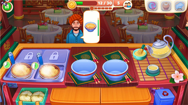 煮好了就可以盛到碗里,点击面条给顾客会获得金币,完美烹饪还能获得额外小费。