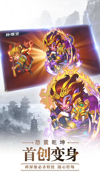 变身系统在传统卡牌玩法上实现了突破性进化。每个英雄都拥有三种战斗形态,通过消耗"灵气值"自由切换。以猪八戒为例,可在"天蓬元帅""净坛使者""猪刚鬣"三种形态间转换,分别对应坦克、辅助、输出定位。更精妙的是,变身瞬间附带0.5秒无敌帧,高手玩家常利用这个机制躲避关键技能。游戏还设计了"变身连锁"机制,当队伍中多个英雄连续变身时,会获得攻击力叠加的增益效果。