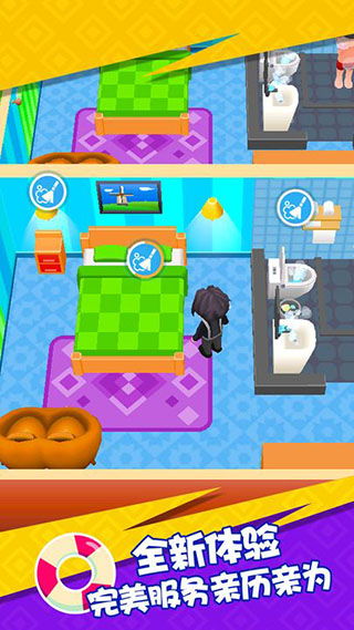 进入游戏场景后,点击屏幕控制角色移动,靠近门口的客人,点击【WELCOME】迎接客人。建议优先升级接待区设施,这样可以缩短客人等待时间,提升整体满意度。同时注意观察客人的表情变化,及时调整服务策略。