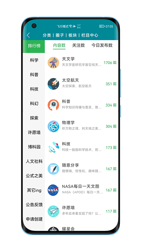 博科园即广泛领域的科学知识园地,并努力创造和打造一个科学圈交流平台,使广大用户能够在一起分享交流,博科园目前共设立天文圈、物理圈、化学圈、地球科学圈、生命科学圈、数学圈、科技圈、科幻圈、太空航天圈、历史文化圈、随意分享圈、科普圈、学生圈、IT计算机科学圈、神器干货圈、许愿墙圈、耀星会圈、APC格物社圈等18个科学圈。每个科学圈都有专业版主管理,定期组织线上讨论会。用户可以关注感兴趣的科学圈,第一时间获取圈内最新动态和优质内容。