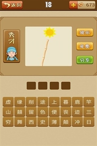 3. 拆字猜成语:游戏将成语拆分为单个汉字或偏旁部首,玩家需要将这些部分重新组合成正确的成语。例如,给出“口”、“木”、“目”、“心”四个字,玩家需要拼出成语“目瞪口呆”。这种玩法锻炼玩家的汉字组合能力。