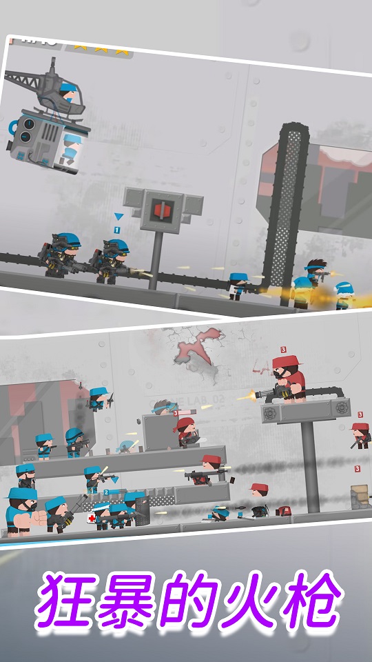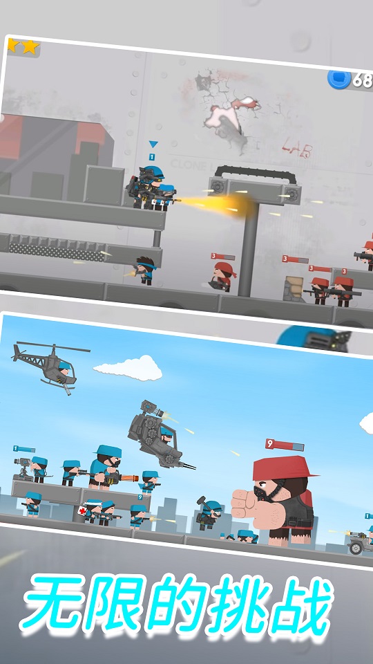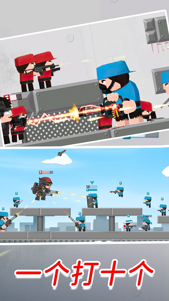 完成更多的挑战任务,这样就可以去解锁更多的士兵,去完成战斗。游戏设有100多个成就任务,完成后可获得丰厚奖励。玩法也是相当的简单的,你只需要点击屏幕就可以去进行操作。游戏采用虚拟摇杆+按键的经典操作方式,响应灵敏。多种不同的模式你可以去进行挑战,每一个模式遇见的挑战不同。包括团队竞技、爆破模式、生存模式等多种玩法,满足不同玩家的需求。