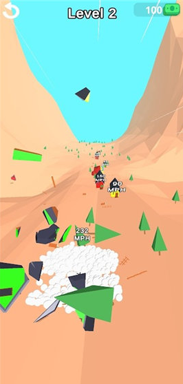 玩家通过滚雪球破坏小树等物体来扩大雪球体积完成雪崩任务。破坏物体时会有爽快的视觉效果,给玩家带来成就感。