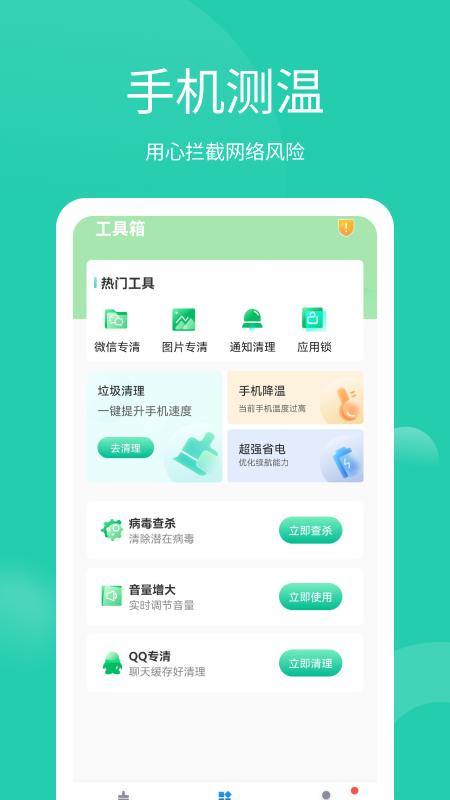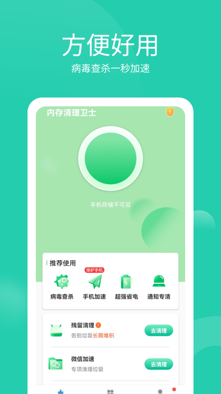 手机内存清理卫士app是一款功能强大的手机优化工具,能够帮助用户轻松解决手机卡顿、内存不足等问题。通过智能扫描技术,它可以快速识别并清理各类垃圾文件,包括缓存、残留安装包、临时文件等,有效释放存储空间。同时,该软件还具备病毒查杀、温度监控等实用功能,全方位保护手机安全。简洁直观的操作界面让用户能够一键完成清理,无需复杂设置,即使是新手也能轻松上手。无论是日常维护还是深度清理,这款软件都能为用户带来流畅的手机使用体验。