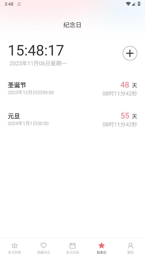 生日倒计时管家是一款贴心实用的生活助手软件,专注于帮助用户记录和管理各类重要日期。它不仅具备基础的日历查看功能,还能让用户自由设置个性化的倒计时提醒,无论是亲友生日、工作纪念日还是特殊节日,都能通过智能提醒确保您不会错过每一个值得纪念的时刻。简洁直观的界面设计搭配强大的提醒功能,让时间管理变得轻松又有趣,是提升生活仪式感的必备工具。