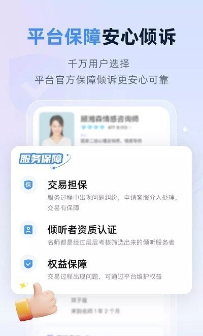 这款软件的所有咨询师都经过专业机构的认证和系统培训,具备丰富的实战经验。平台采用严格的筛选机制,确保每位老师都能提供高质量的服务。除了常见的家庭、婚姻问题,还特别关注校园暴力和职场压力等社会热点问题,为抑郁症、焦虑症患者提供专业支持。软件界面设计人性化,操作流程简单直观,即使是中老年用户也能轻松使用。此外,平台还提供智能匹配功能,可以根据用户的具体需求推荐最适合的咨询师。