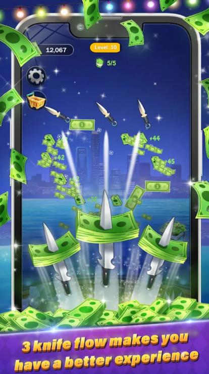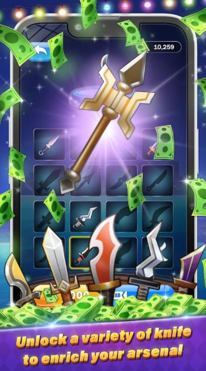 在游戏的界面之中你会利用到一把锋利的刀来击碎游戏之中的钱。特制的砍钱刀经过强化升级后,可以轻松斩断成捆的钞票,甚至能劈开坚固的保险柜,看着金钱四散飞舞的快感无与伦比。