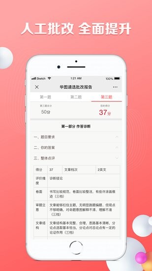 区别于机器批改,平台提供专业教师一对一人工批改服务。批改老师会根据评分标准,从内容、结构、语言等多个维度给出详细评语,指出具体失分点,并提供改进建议。这种精准的反馈机制能帮助考生快速提升答题水平。