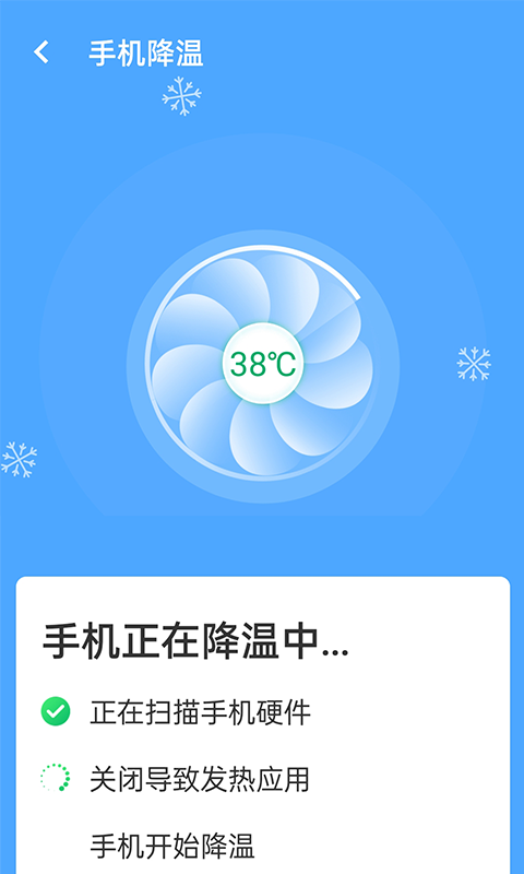 【手机降温】内置智能降温功能,一键清理后台运行程序,释放内存,有效降低手机温度,解决因长时间使用导致的发热问题。