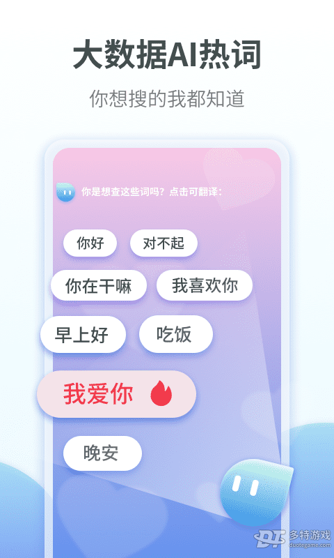 如果你不会说广东话,怎么去澳门旅游?陪老板出差,不会说广东话怎么办?粤语翻译是你的粤语翻译。软件独创的实时翻译功能可以快速转换普通话和粤语,特别适合商务洽谈和旅行场景。为你的老板和你自己做一个私人粤语翻译!出行自由游玩,工作二次晋升。翻译单词或句子时,会对选中的单词或句子进行标记,并同步显示拼音和音标,让学习过程一目了然。独特的收藏夹功能还能帮你整理常用语句,建立个性化词库。