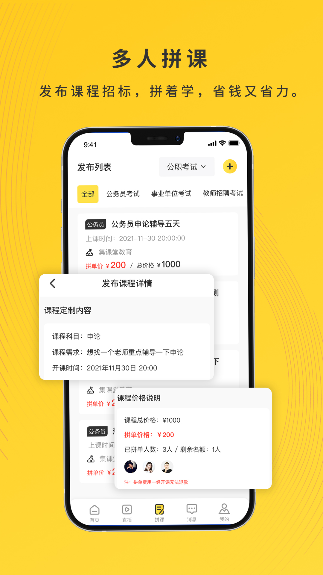实时直播功能让学习更具互动性,打破传统线上学习的孤独感,实现师生实时交流。创新的拼课模式让用户可以发布课程需求,寻找志同道合的学习伙伴,既能分摊学习成本,又能相互督促进步。多人拼课功能进一步优化了学习成本,让优质教育资源更加普惠。师者模块汇聚了众多经验丰富的教育工作者,他们不仅传授专业知识,更注重培养学生的思维能力和学习方法。