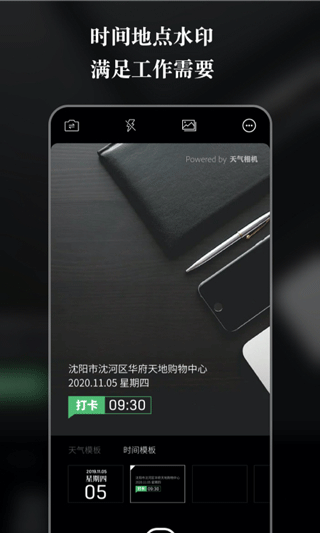 打开天气相机app即可看到灯光调节、镜头翻转、相册导入、风格选择等实用功能