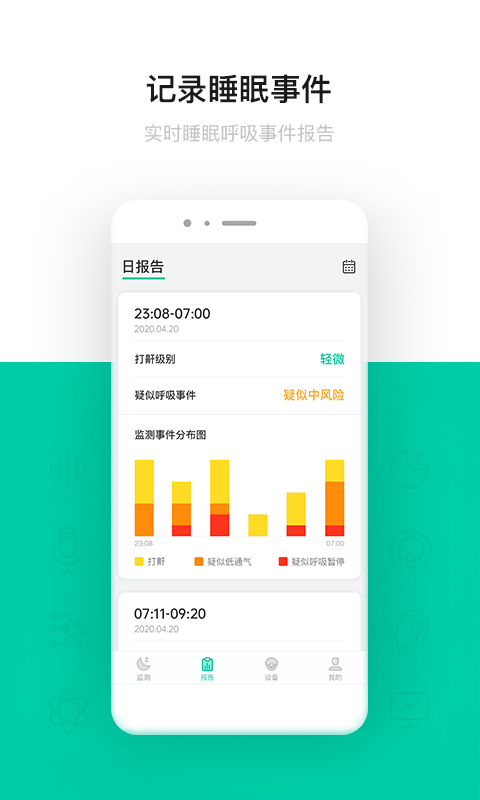 睡眠质量报告:系统采用多参数综合评估体系,包括呼吸暂停次数、鼾声分贝、深浅睡眠时长占比等12项专业指标,生成详尽的睡眠分析报告。报告不仅包含数据统计,还会标注异常指标,帮助用户重点关注呼吸健康风险。