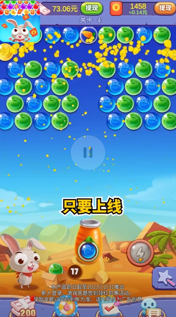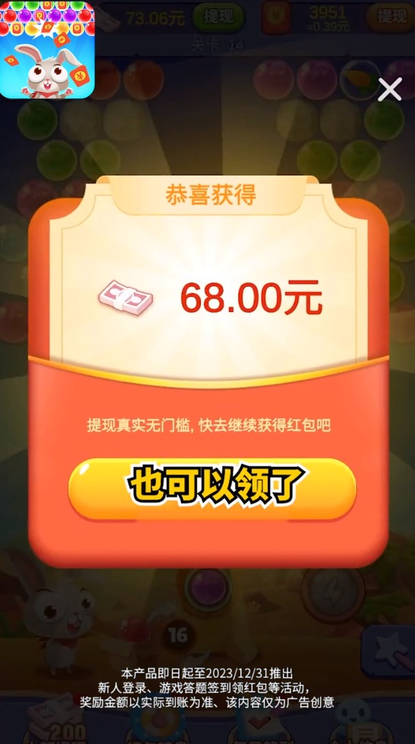 新年打泡泡是一款以经典泡泡龙玩法为核心的休闲益智小游戏,不仅能够带给玩家轻松愉快的游戏体验,还能让玩家在娱乐的同时获得实实在在的红包奖励。只要登录游戏参与挑战,就有机会赢取高达68元的现金红包,玩得越多赚得越多,所有奖励都可以直接提现到您的账户,没有任何复杂的条件和门槛限制。