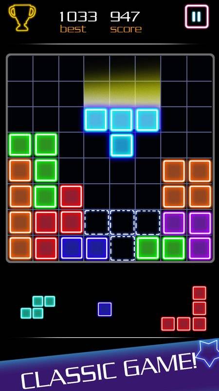 《发光块拼图》的核心玩法是放置拼图块来创建并消除完整的行或列。与传统的俄罗斯方块不同,游戏中的方块不能旋转,这为游戏增添了独特的策略性。玩家需要更加谨慎地考虑每个方块的摆放位置,因为一旦游戏区域下方的空间被填满,游戏就会立即结束。值得一提的是,游戏没有任何时间限制,玩家可以按照自己的节奏进行思考,也不必担心网络问题会影响游戏体验。这种轻松自由的游戏氛围让玩家能够完全沉浸在拼图的乐趣中。
