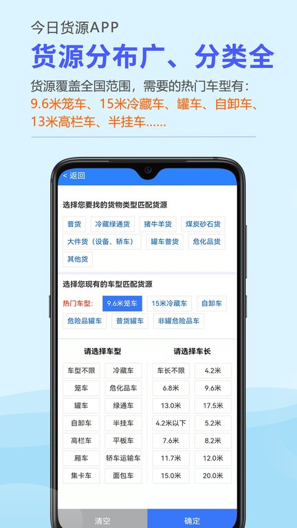 支持多种热门车型匹配,如9.6米笼车、15米冷藏车、罐车、自卸车、13米高栏车、半挂车等,确保各类运输车辆都能找到合适货源。