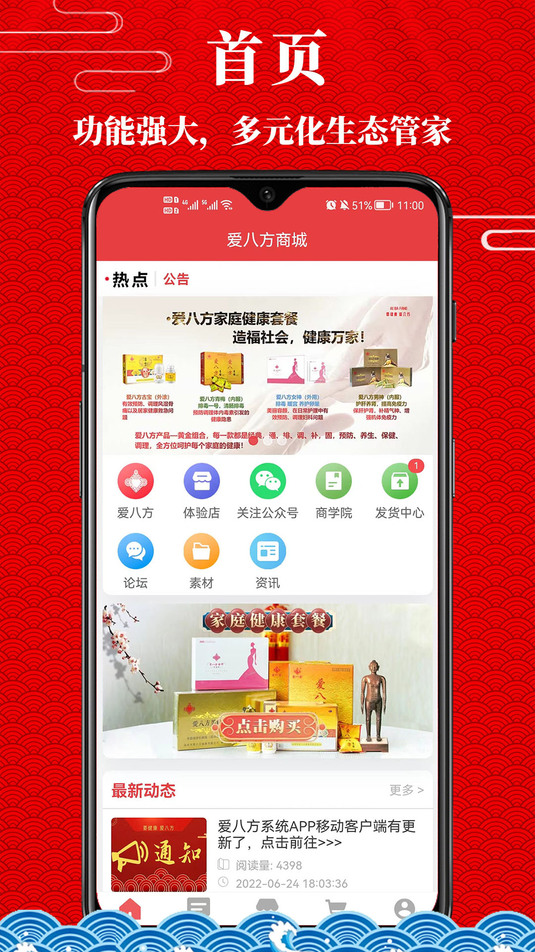 爱八方商城是一款融合实体与互联网优势的创新订阅平台,致力于为用户提供全方位的健康生活解决方案。平台不仅支持对爱八方业务范围内的各类商品进行便捷订阅和购买,更通过数字化技术将健康服务延伸到用户的日常生活中。爱八方作为一家综合性健康产业集团,其业务范围涵盖中医文化传承、中医药研发与生产、健康产品销售流通、专业骨科连锁服务以及护身宝生命健康数据化平台等多个领域。