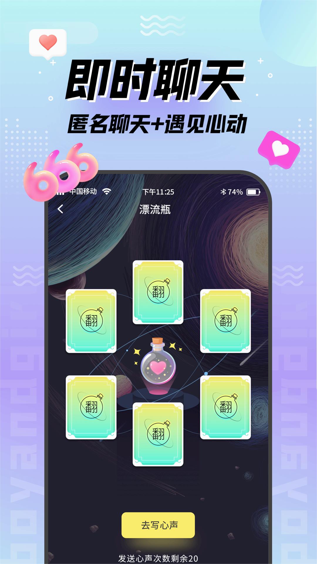 陌趣漂流瓶是一款集聊天交友、同城约会、陌生人社交于一体的优质社交软件。它不仅是一个简单的交友平台,更是一个记录生活、分享美好的温馨社区。无论你是想倾诉心事,还是希望找到志同道合的朋友,这里都能满足你的需求。24小时活跃的用户群体,让你无论何时登录都能找到陪伴,从此告别孤独时光。平台严格把控用户质量,致力于打造一个安全、可靠的社交环境。
