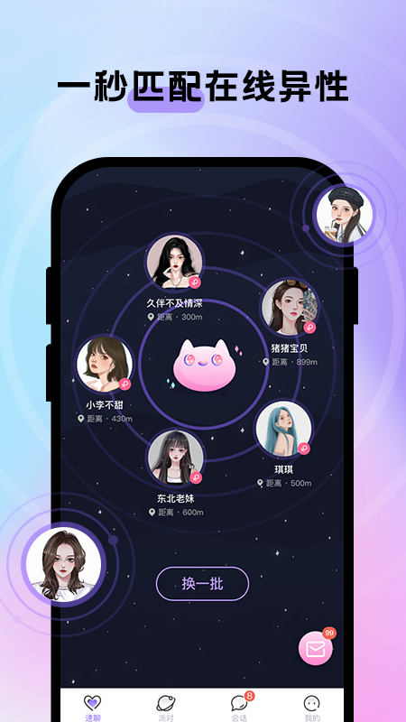 - 一秒匹配在线异性:先进的智能匹配算法,让你在最短时间内找到合适的聊天对象,告别漫长的等待和无效社交。