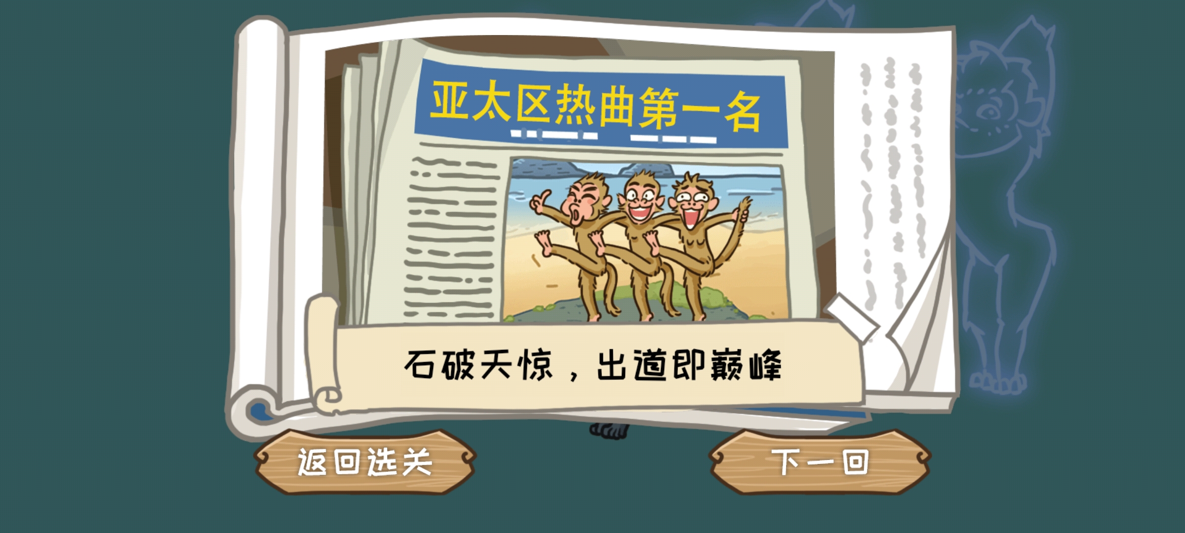 第二关的解法是来回抚摸中间猴子的头部,这个操作看似简单却充满趣味性,展现了游戏的幽默风格。