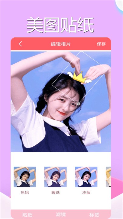 ·【美图贴纸】实时预览精美贴纸效果,上千款动态贴纸随心搭配,让你的照片充满趣味性和创意感。