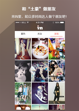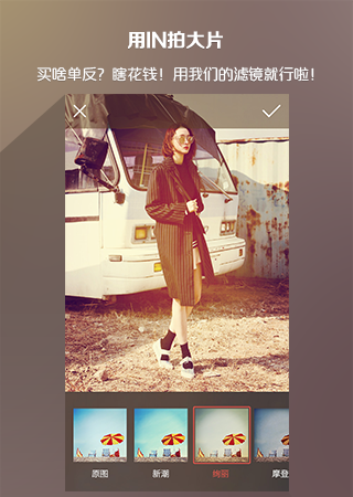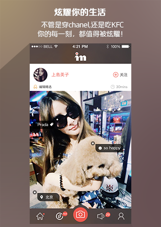 ————不管是穿chanel,还是吃kfc,你的每一刻,都值得被炫耀!IN-时尚提供专业级美化效果,让平凡的生活瞬间变得高大上,随时随地分享你的精彩瞬间。