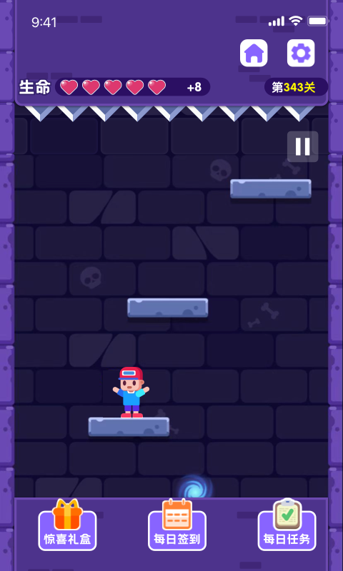 天天下100层是一款充满刺激与挑战的休闲跳跃游戏,玩家将置身于一个不断下落的危险平台世界。在这里,你需要控制角色持续向下跳跃,稍有不慎就会导致游戏失败。游戏过程中不仅要把握精准的跳跃时机,还要时刻警惕各种突如其来的陷阱和障碍物,考验玩家的反应能力和操作技巧。