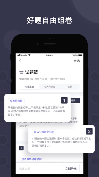 找题宝拥有多项创新功能,让学习变得更加高效有趣。独特的"试题篮"功能让您可以像购物一样自由组合不同知识点的题目,轻松创建个性化练习卷。生成的PDF文档清晰度高,支持A4纸打印,保护孩子视力同时满足纸质练习需求。便捷的分享功能让您可以通过微信等社交平台快速传递学习资料,与同学、老师保持高效互动。