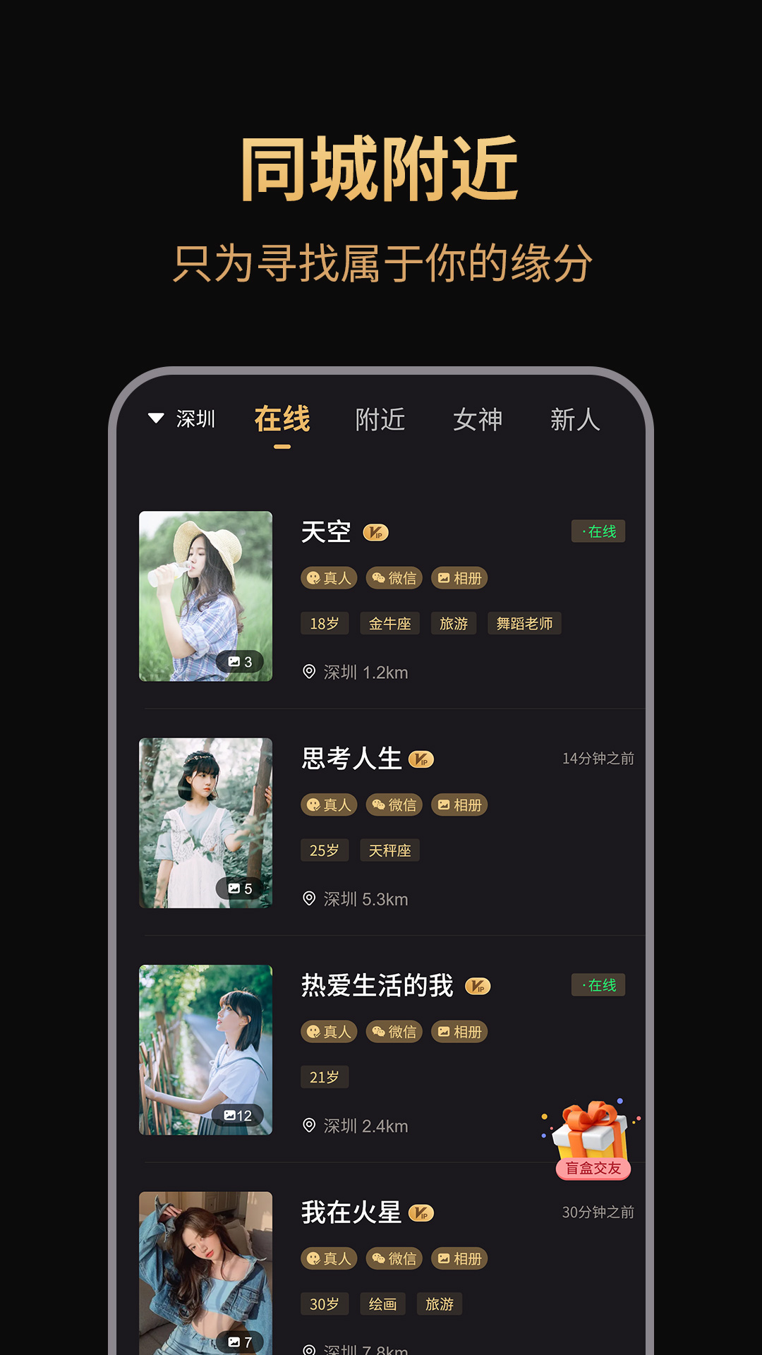 奢甜APP是一款专为高端人士打造的同城社交平台,汇聚了各行各业的精英人士和高颜值用户。在这里,你可以一键搭讪附近的人,轻松结识志同道合的朋友,结伴出游、分享生活。奢甜APP采用严格的真人认证机制,确保用户真实可靠,同时提供多重隐私保护功能,让你的社交体验更安全、更放心。无论是寻找有趣的灵魂,还是邂逅心动的Ta,奢甜APP都能满足你的需求。快来下载体验,开启你的高品质社交之旅!