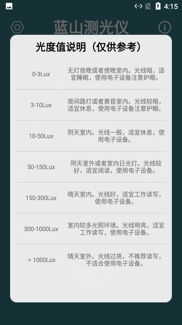 蓝山测光仪app针对各类光线测试需求进行了深度优化,让用户能够及时了解最佳测试方案。通过这款app,用户可以快速体验多种测光模式,全面掌握测光感度的各项指标。丰富的功能设置让测光过程更加高效便捷,无论是专业摄影还是日常拍摄都能轻松应对。