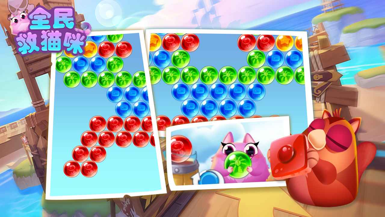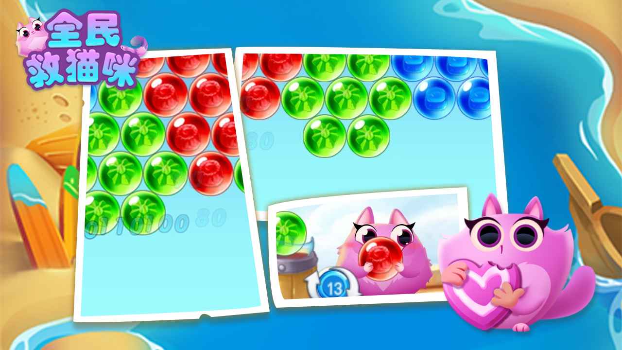 在一个阳光明媚的日子里,一群毛茸茸的小猫咪正在金色沙滩上快乐地嬉戏玩耍。它们追逐着浪花,堆着沙堡,享受着美好的午后时光。然而好景不长,一只来自深海的神秘章鱼怪突然出现,它喷吐出无数气泡将小猫咪们一个个抓走。作为正义的使者,玩家必须挺身而出,运用智慧与勇气,通过消除球球来收集能量,最终将这些可爱的小猫咪从章鱼怪的魔掌中解救出来。