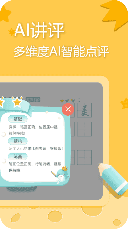【AI讲评】AI多维度,智能点评。通过使用美书智能笔在配套的智能字帖上书写可以通过AI算法对小朋友的笔迹进行"基础"、"结构"、"笔画"三个维度进行点评,并通过实时互动,帮助小朋友及时更正书写错误。系统还会根据孩子的书写特点,智能推荐适合的练习内容,确保每次练习都能获得最大收获。AI讲评功能让练字不再盲目,每个笔画都能得到专业指导。