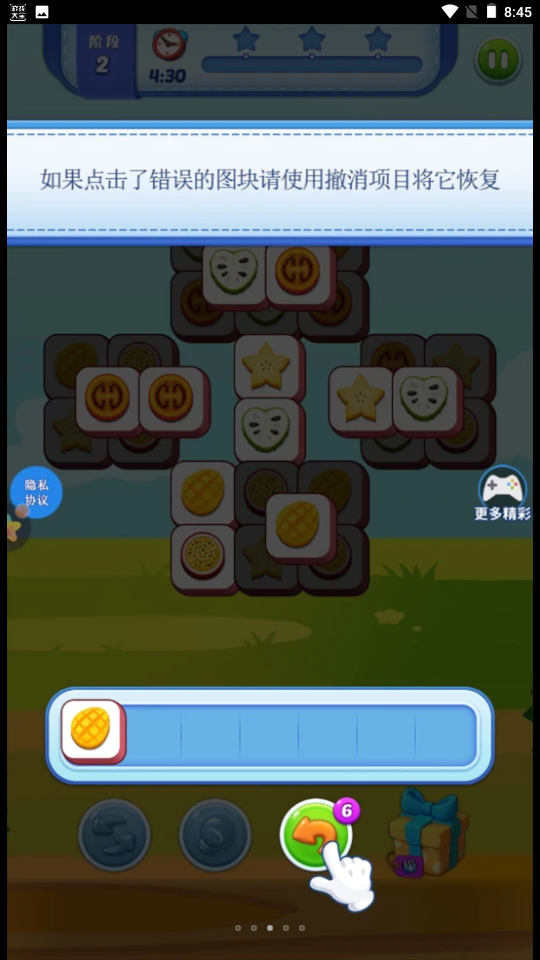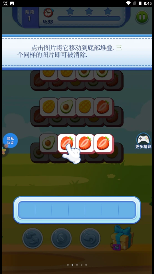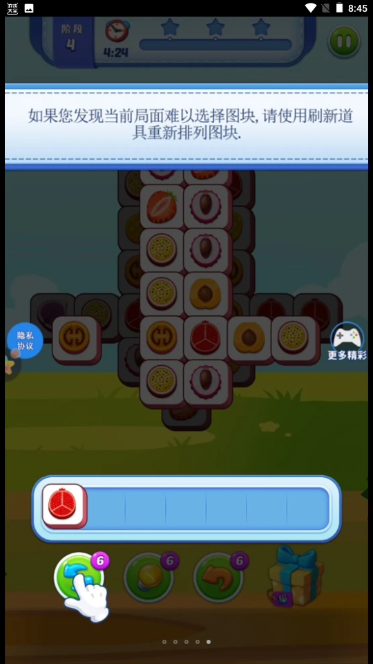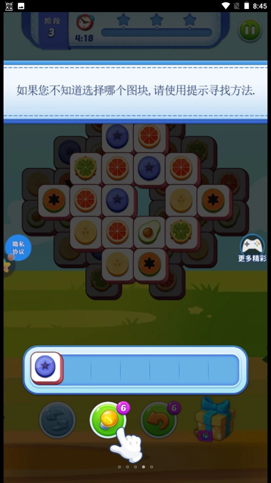 游戏提供了多种实用功能来帮助玩家应对挑战。暂停功能可以让您在需要时暂停游戏,此时游戏画面会被黑屏覆盖,但计时器会停止,让您有充足的时间思考下一步。每关都会赠送三次提示机会,当您遇到困难时,系统会随机显示一组正确的消除组合。随着关卡推进,难度会越来越高,因此要合理使用这些提示机会。此外,每关还有三次重排机会,点击后当前方块阵列会重新排列,这可能是突破困境的关键。
