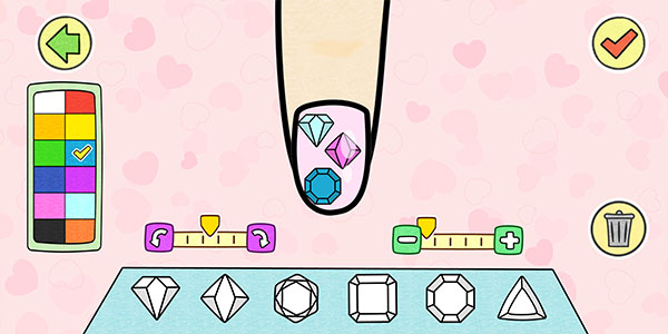 来到装饰物品阶段后,点击即可添加指定装饰物,拖动可改变位置,左方进度条可调整旋转角度,右侧进度条可调整装饰大小,完成之后点击右上角可完成当前指甲的装饰,返回手部界面,其他手指同样按照前方步骤装饰,并点击右上角勾号即可完成当前装饰。装饰品库每周都会更新新品,玩家可以通过完成任务获得金币来解锁更多精美饰品。
