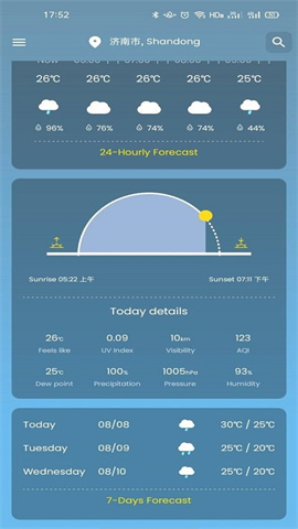 界面设计简洁直观,主页面集中显示核心天气数据,次级页面提供详细分析。支持手势操作,左滑右滑即可切换不同功能模块。
