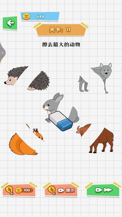 游戏的核心玩法围绕"橡皮擦"这一创意工具展开,玩家需要通过擦除画面中的特定元素来解开谜题。不同于传统解谜游戏,本作将绘画与解谜完美结合,让玩家在擦除过程中体验创作的乐趣。游戏包含上百个精心设计的关卡,每个关卡都讲述着独特的小故事,从简单的图形擦除到复杂的场景互动,难度循序渐进。随着游戏进程,玩家还能解锁各种特殊橡皮擦道具,为解谜过程增添更多可能性。