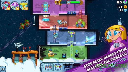 玩家将完全站在反派立场,体验与众不同的游戏视角,不仅要抢夺公主,还要想方设法击败前来挑战的勇士们。