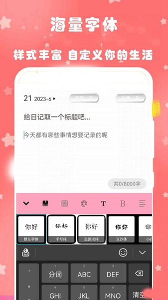 提供超过50种特色字体,从优雅的手写体到可爱的卡通字,让你的文字表达更加生动传神,完美匹配不同心情的日记内容。