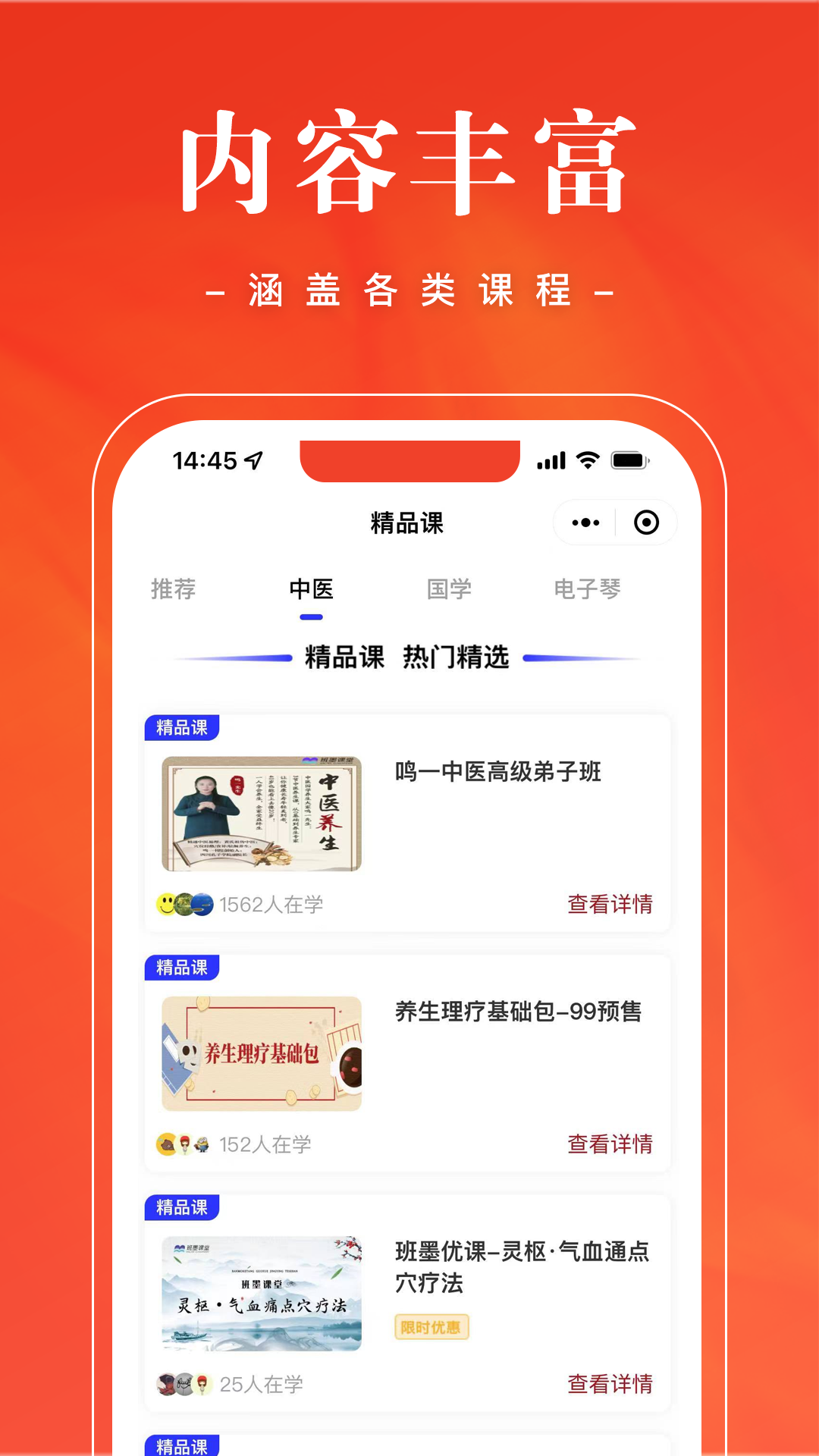 班墨优课致力于打造优质的中老年在线学习平台,涵盖了中医养生大讲堂、易学大讲堂、电子琴教学和等多种精品课程。平台拥有强大的金牌教学教研团队,汇聚了各领域的知名专家和资深讲师,确保课程内容的专业性和实用性。目前已经帮助百万用户学习专业知识、丰富业余生活!平台采用智能推荐系统,可根据用户的学习偏好和进度,个性化推荐适合的课程内容,让学习更加高效便捷。