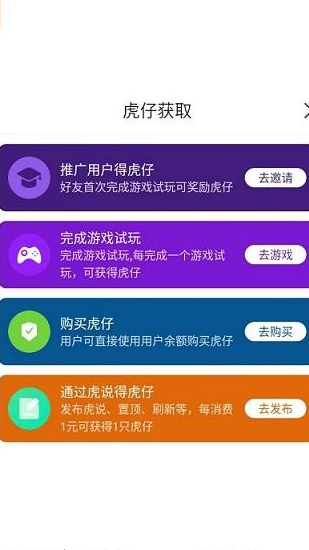 好友首次完成游戏试玩时,推荐人可以获得虎仔奖励;用户自己完成游戏试玩也能获得虎仔,每完成一个游戏试玩任务就能得到相应数量的虎仔;如果希望快速增加虎仔数量,用户可以直接使用账户余额购买虎仔;此外,通过发布"虎说"内容、置顶、刷新等操作,每消费1元就能获得1只虎仔。