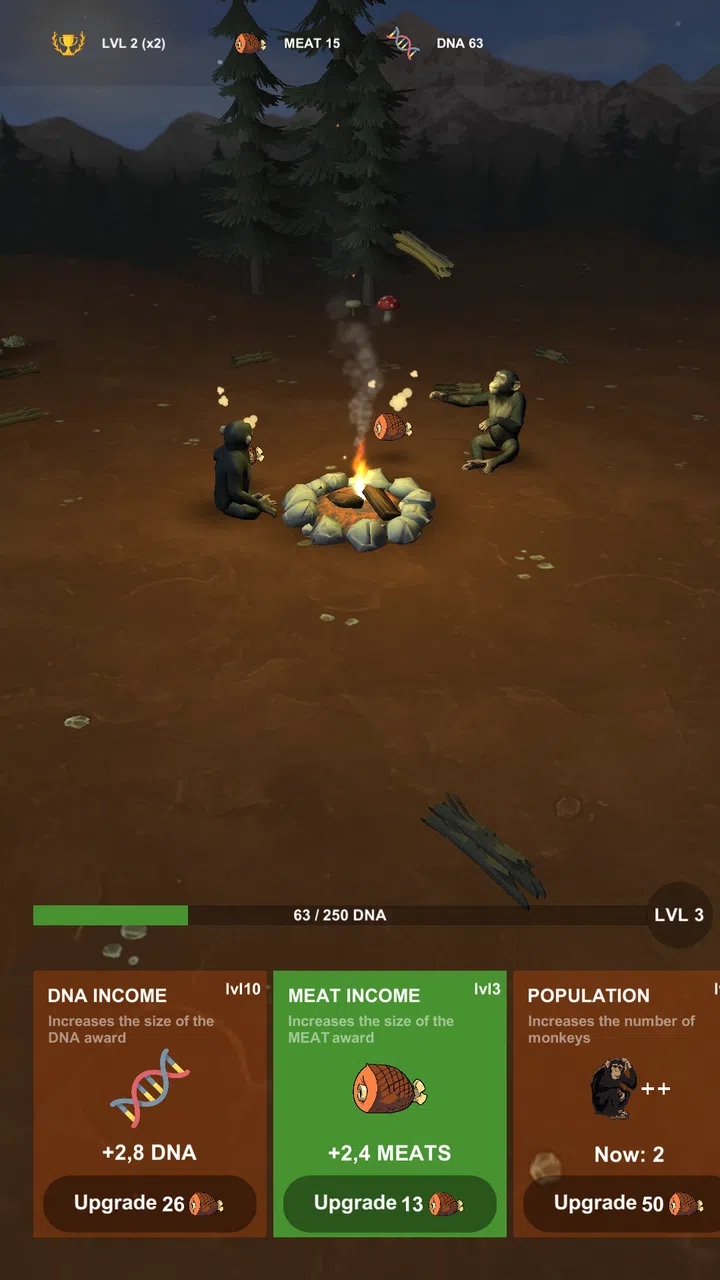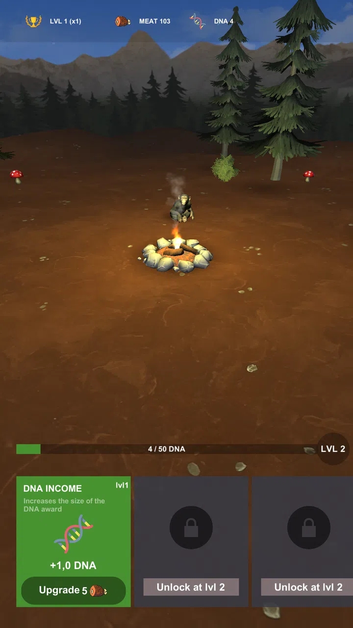 在篝火进化论中,玩家需要通过不断改善生存环境和提升技能来获得更好的生存条件。游戏的核心玩法围绕着篝火的进化展开,玩家需要收集各种木材来升级火焰,从最初的小火堆逐步进化成熊熊燃烧的大篝火。随着火焰等级的提升,你可以烤制更多种类的食物,获得更长的生存时间。游戏中独特的DNA系统让玩法更加丰富,通过收集DNA可以解锁新的能力和技能,比如更快的奔跑速度、更强的捕猎能力等。在漆黑的夜晚,你可以围绕篝火进行各种有趣的活动,比如烤制食物、制作工具、研究新技能等,这些活动不仅有趣,还能帮助你更好地生存下去。