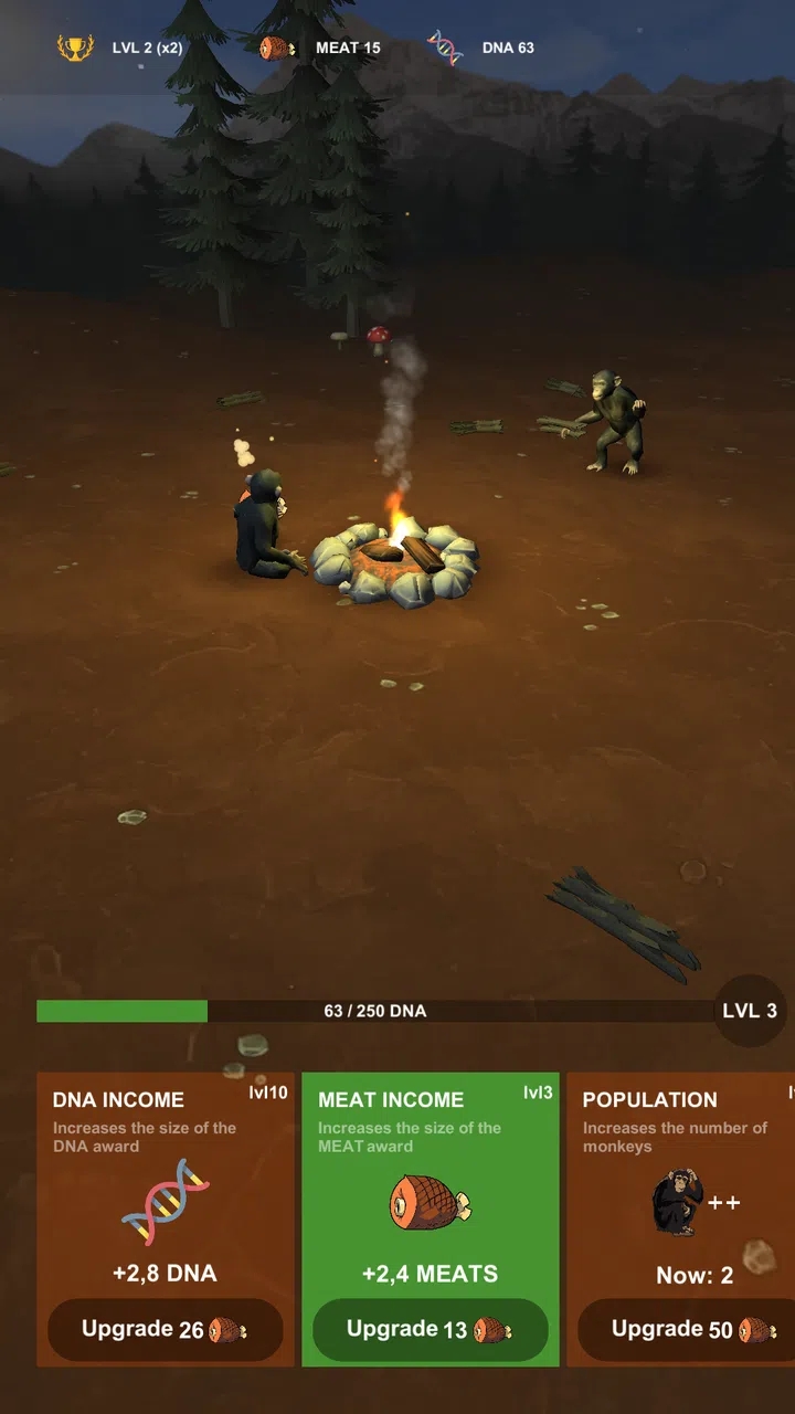 篝火进化论是一款超级有趣的生存模拟游戏,它拥有精心设计的游戏剧情和独特的玩法机制。游戏将玩家带入到一个充满神秘色彩的远古时期,在这里你将化身为一只聪明的大猩猩,生活在郁郁葱葱的原始森林中。作为一只刚刚觉醒智慧的猩猩,你首先要解决的是基本的生存问题——寻找食物和学会生火。通过不断地探索和实践,你将掌握生火技能,把捕获的猎物烤制成美味的食物,让自己在这个原始世界中生存得更加美好。游戏中的昼夜交替系统让生存体验更加真实,每个夜晚都需要依靠篝火来驱散黑暗和危险。