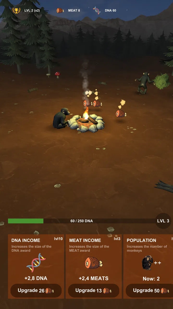 篝火进化论是一款充满趣味性的休闲冒险游戏,玩家将扮演一只可爱的大猩猩,在原始森林中展开一段奇妙的生存之旅。游戏以独特的篝火进化系统为核心玩法,玩家需要通过收集木材、升级火焰、制作食物来帮助大猩猩在危机四伏的原始世界中生存下去。精美的画面和轻松的音乐营造出一个令人沉浸的远古世界,让玩家仿佛真的置身于那片神秘的原始森林。