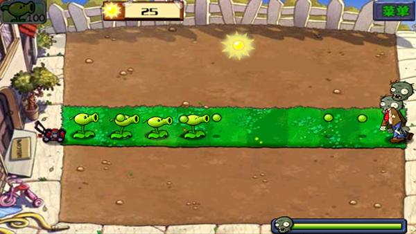 可以看到左上角有豌豆射手和太阳,第一关的一个太阳是25的能量,需要4个太阳即可种植一个豌豆。记住要合理分配阳光,不要一次性把所有阳光都用完。